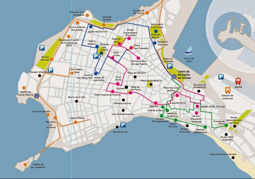 Кстати, железнодорожный вокзал Кадиса находится рядом с портом. Вообще на этом полуострове нетрудно заблудиться, все можно обойти за несколько часов, плюс там есть крутая фишка - туристические маршруты разрисованы цветными линиями. В туристических центрах, например, на вокзале можно взять бесплатную карту и бродить по городу.