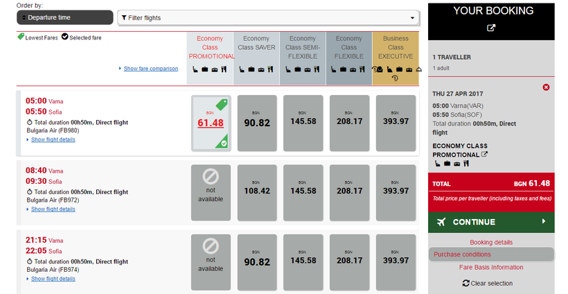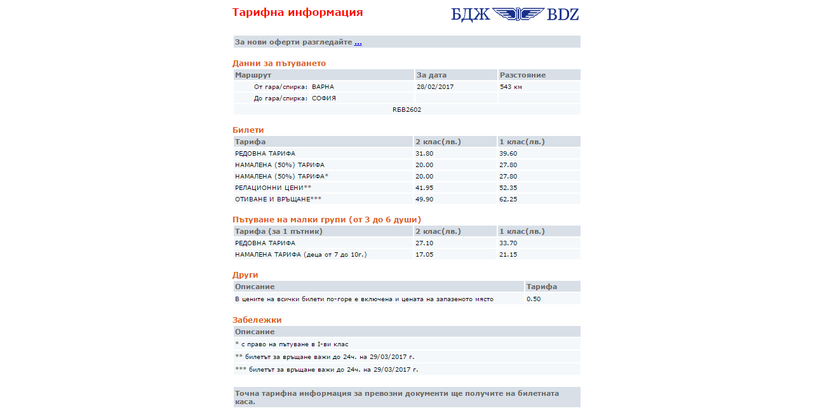 Стоимость билета зависит от его класса и времени покупки. Самый дешевый билет, который я находила, обходился в 61 лев (около 30 евро). В среднем же билеты стоят 90-100 лева (45-50 евро).