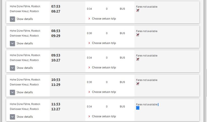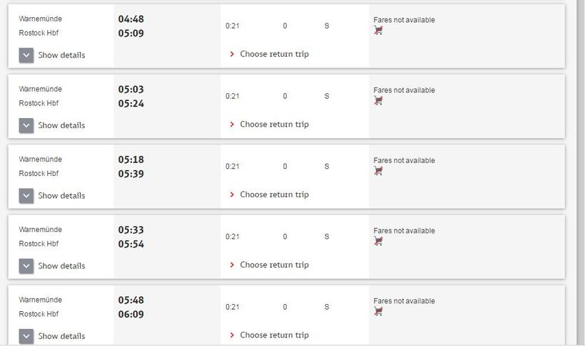Время в пути составляет около 20 минут (если поезд не опоздает, конечно). Прибывают поезда на станцию Rostock Parkstraße, расположенную вот здесь: Также можно добраться и до главной железнодорожной станции Ростока, Rostock Hauptbannhof, расположенной немного южнее: Начинается движение в полночь, а заканчивается в 23:33. Поезда идут с интервалом раз в полчаса, можно убедиться на сайте или на скриншоте: