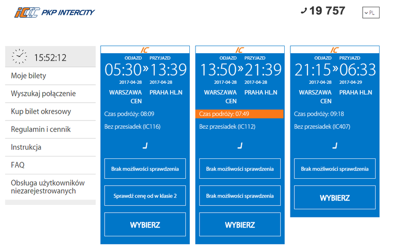Расписание с сайта LOT Из Варшавы в Прагу на поезде