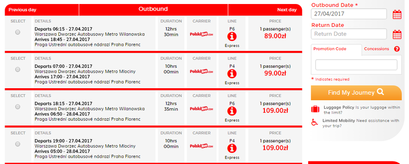 У RegioJet только один рейс в два дня – в 9:15. Условия в салоне такие же, как у PolskiBus, но ещё есть бесплатный кофе. Автобусы RegioJet выезжают с автовокзала Варшава-Центральная.Какую бы компанию вы не выбрали, на дорогу уходит не менее 10 часов. В Праге автобусы останавливаются на автовокзале Флоренц.