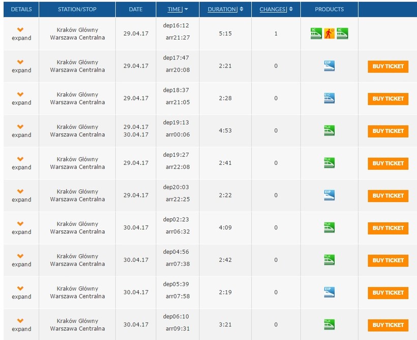 Вот не люблю я их сайт железной дороги, черт ногу сломит, пока путнее найдет. Наверно поэтому я чаще езжу автобусами, да и дешевле. Поезда в Варшаву ездят практически круглосуточно, в часы пик каждые 30 минут.
