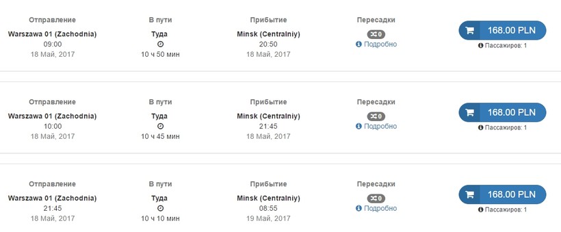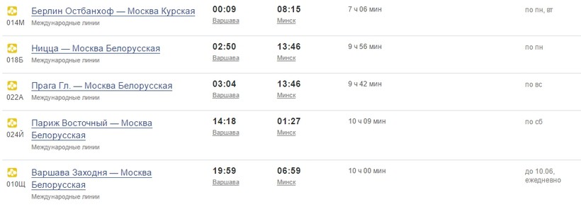 Между этими городами налажено также и железнодорожное сообщение. Через Варшаву и Минск проходит ряд международных поездов, идущих с разных точек Европы в Москву. Они останавливаются в нужных нам городах для высадки и посадки пассажиров.