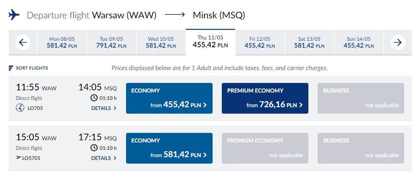 А вот польская компания LOT - от 456 злотых (114 евро).