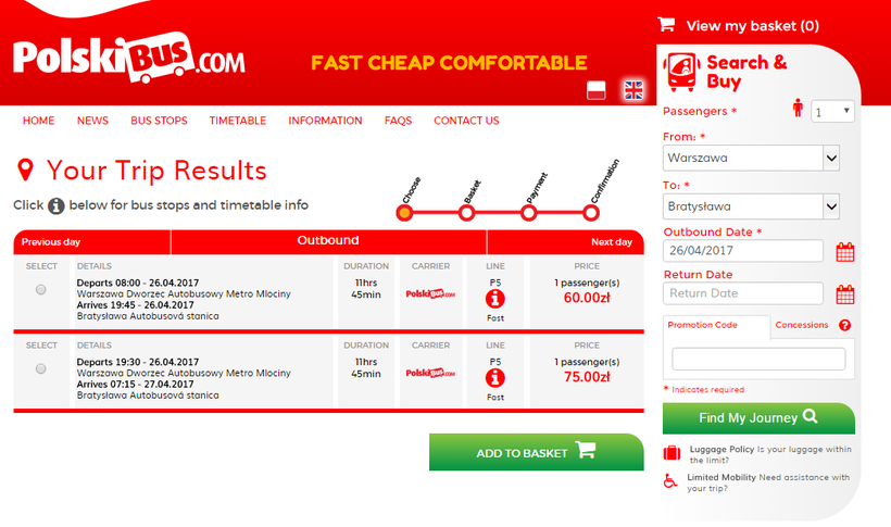 Поездка на автобусе – это, пожалуй, самый демократичный и экономный способ добраться в Братиславу. Автобусный рейс соединяющий две столицы обслуживает польская компания Polskibus. Каждый день в Братиславу отправляется два автобуса – в 8:00 и в 19:30, на дорогу уходит почти 12 часов. Обратите внимание – автобусы отправляются не с Западного автовокзала, как другие международные рейсы, а от станции метро Mlociny.