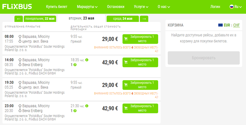 Последний аргумент в пользу Flixbus – билеты по 29 евро. У Eurolines билеты стоят по 34 евро.