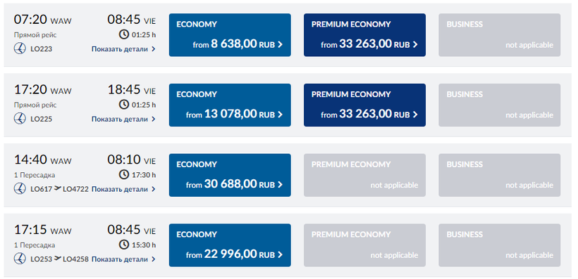 Билеты доступны на сайтах авиакомпаний: Austrian и LOT. Можно посмотреть билеты на сторонних сайтах вроде такого, порой билеты с пересадкой обходятся дешевле прямого перелёта.