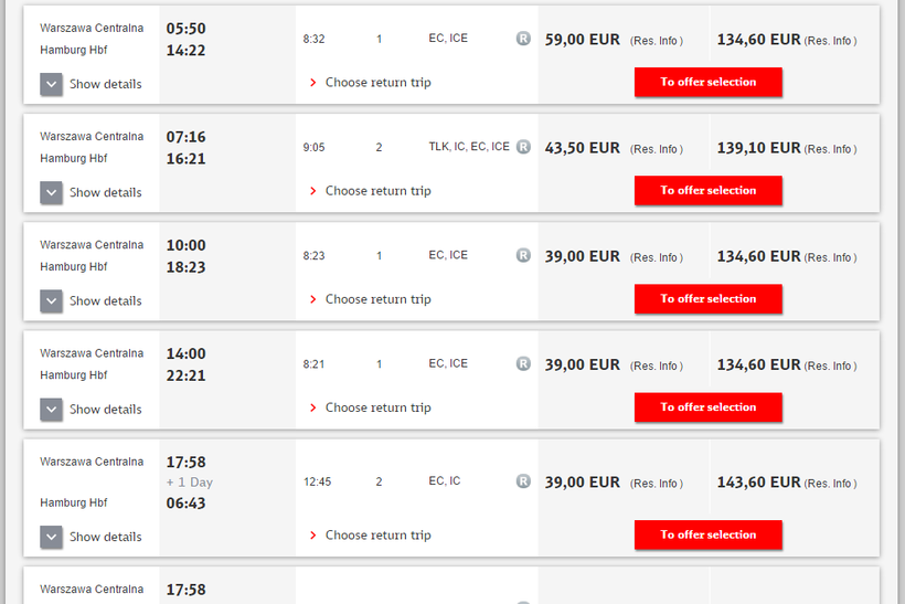 Поезда отправляются с Центрального ЖД вокзала Варшавы. В день уходит около семи поездов, время в пути – различное. Я добрался до Гамбурга за восемь с половиной часов, но бывают и более долгие рейсы – здесь нужно смотреть индивидуально. В Гамбурге поезда останавливаются на Центральном вокзале.