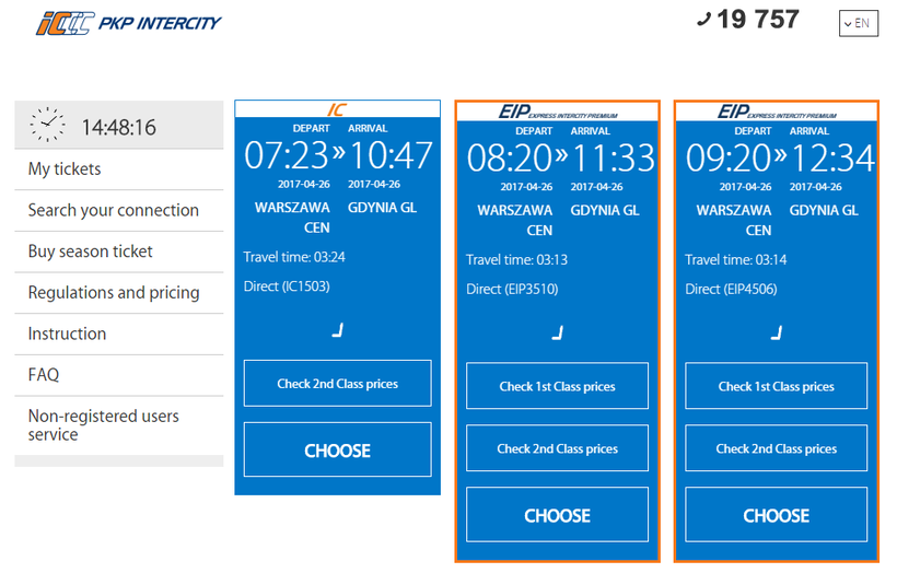 Поезд намного лучше чем автобус. Автобусы выезжают только ночью, в то время как поезда ходят регулярно каждый час с 6:20 до 20:20. Поезд тратит на дорогу до Гдыни чуть более трёх часов. Сесть на поезд можно на Центральном ЖД вокзале Варшавы.С поездами есть одна загвоздка. На дворе 21-й век. Я всегда покупаю билеты через Интернет. Даже не помню, когда я в последний раз обращался в привокзальные кассы. А вот, чтобы купить билет через сайт польских железных дорог, нужно сначала пройти регистрацию. Без регистрации вы даже цену на некоторые билеты не посмотрите. Я такие сложности не люблю. Как владелец небольшого бизнеса могу сказать – чем проще сервис, тем больше клиентов и лучше продажи.