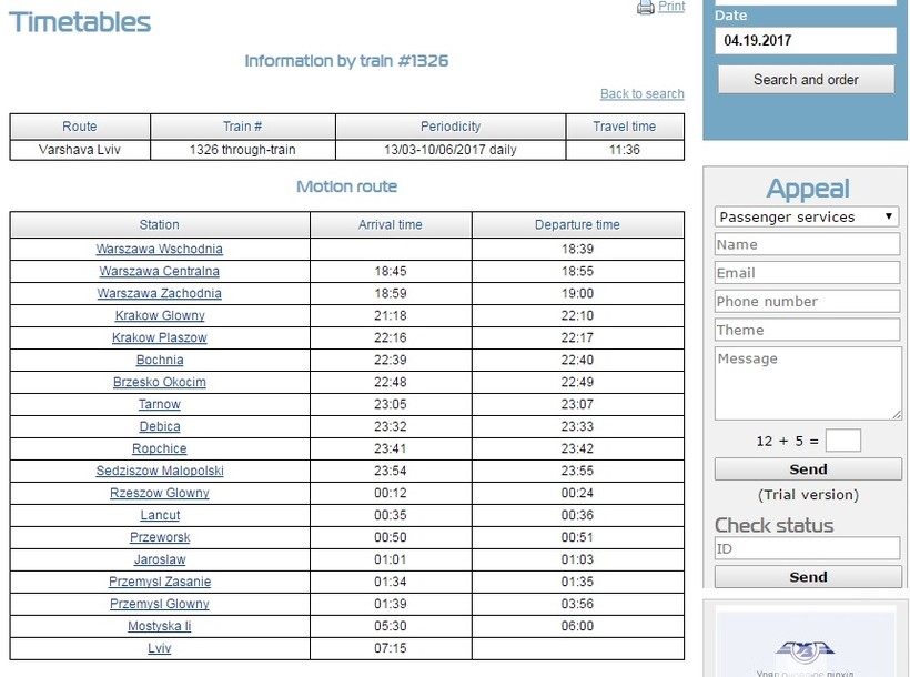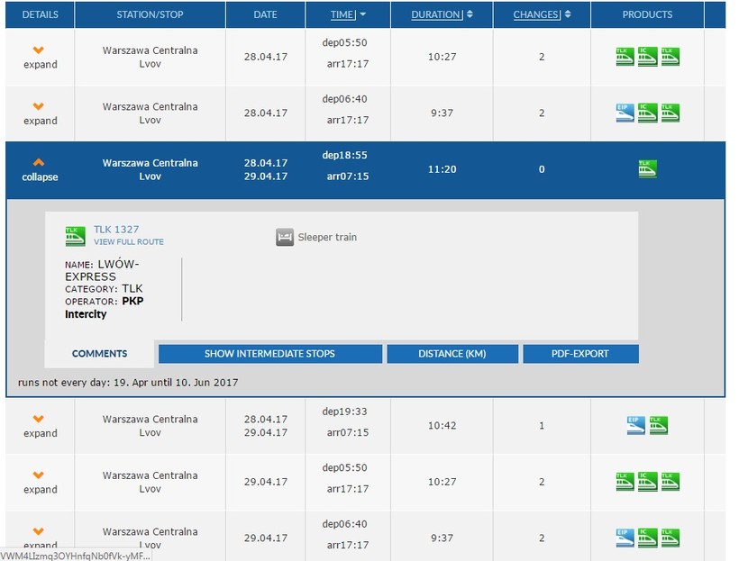 Поезд отправляется ежедневно в 18:39 от станции Warszawa Wschodnia, дальше делает остановки на Warszawa Centralna и Warszawa Zachodnia. В Львов прибывает в 7:15. В поезде вагоны-купе, каждое купе рассчитано на 3 человека. Удобно, что поездка занимает ночь, правда хорошо выспаться не получится, приблизительно с 2-х до 4-х часов ночи разбудят пограничники.