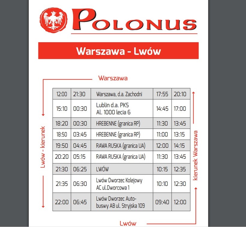 Два раза в день отправляются автобусы компании Рolonus, маршрут следования Warszawa (Zachodnia) - Львов (ж/д вокзал) - Львов (автовокзал):