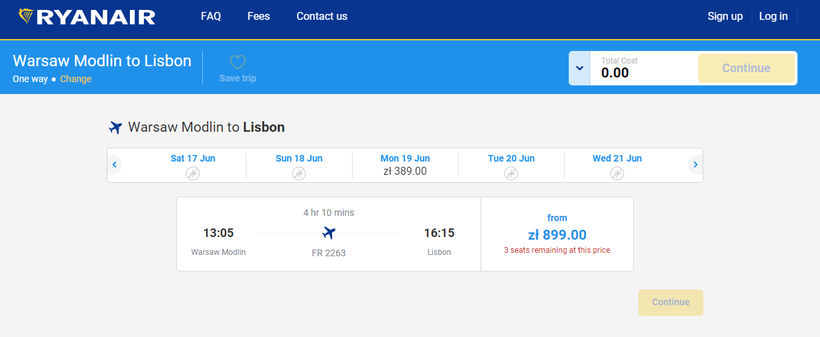 Второй аэропорт Варшавы называется Варшава-Модлин Мазовия. Он находится в 40 км от города, сюда можно добраться на автобусах OKbus и ModlonBus. Остановка автобусов находится возле метро Centrum. Аэропорт Модлин обслуживает компании лоукостеры. Отсюда можно улететь в Лиссабон прямым рейсом компании Ryanair. Компания Ryanair – продаёт одни из самых дешёвых авиабилетов в Европе. Когда я бронировал билеты, то цены у Ryanair и Wizzair были одинаковые, но кто знает как они изменятся в дальнейшем.