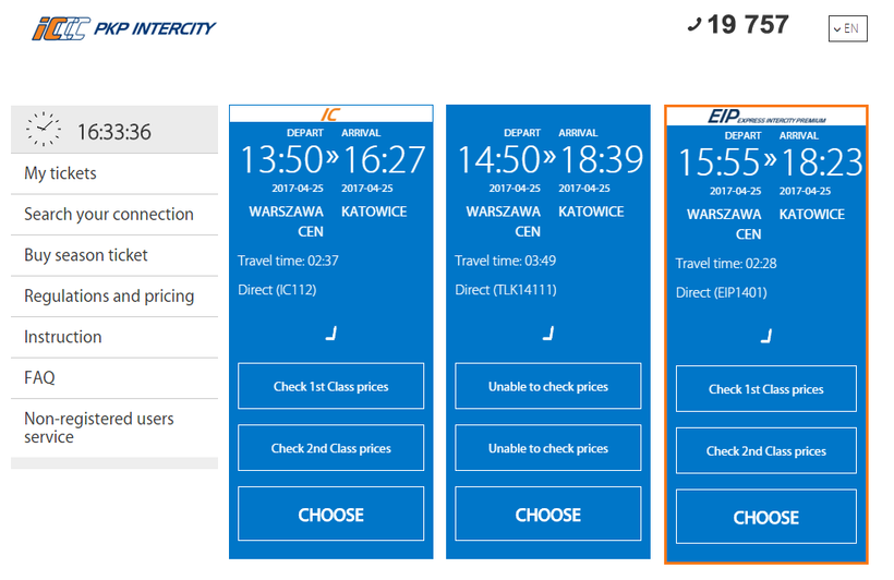 На маршруте работает много разновидностей поездов и цены везде разные. Стоимость билетов начинается от 50 злотых (11-12 евро) и поднимается в 2-3 раза. В поездах EIC и EIP в цену билетов включены напитки и завтрак/ужин.