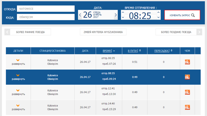 Поезда в Катовице отправляются с Центрального вокзала Варшавы. Они ходят каждый час с 5:30 до 21:15. Ночью прямых поездов нет, можно доехать только с пересадками. Дорога занимает около двух с половиной часов. До Катовице ходят скоростные поезда IC (InterCity), EIC (Express InterCity), EIP (Express InterCity Premium) и обычные поезда TLK. Разница между поездами – в уровне комфорта. В поездах EIC и EIP вагоны новее, кондиционеры работают лучше и работает wi-fi. Я ехал поездом IC – неудобств не заметил, но wi-fi бы не помешал.