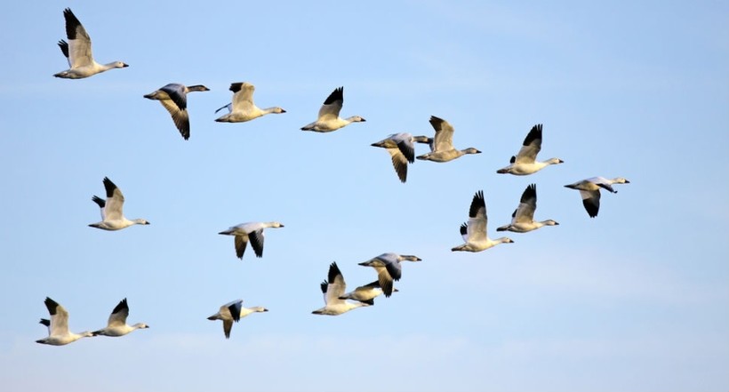 Готовясь к дальнему путешествию, они собираются в стаи, причем каждый вид выбирает свою манеру построения. Это и красивый упорядоченный полет журавлей — клин, и шеренга, когда они чуть ли не касаются друг друга крыльями.