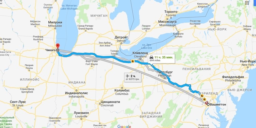 Расстояние между Вашингтоном и Чикаго составляет 511 километров или 318 миль по прямой и 1 119 километров или 695 миль по автодорогам.