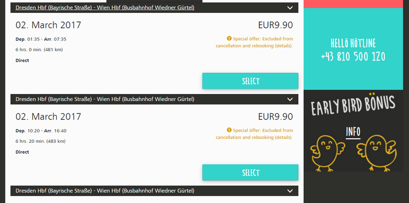У «Flixbus» билеты стоят по 19 евро, а вот у «Hello» всего 9.90 евро! Это просто фантастика! Уверен, так дёшево попасть в Вену могут не многие.