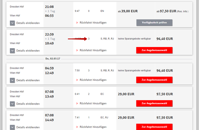 Вот так выглядит сайт «Deutsche Bahn». Обращайте внимание на количество пересадок.