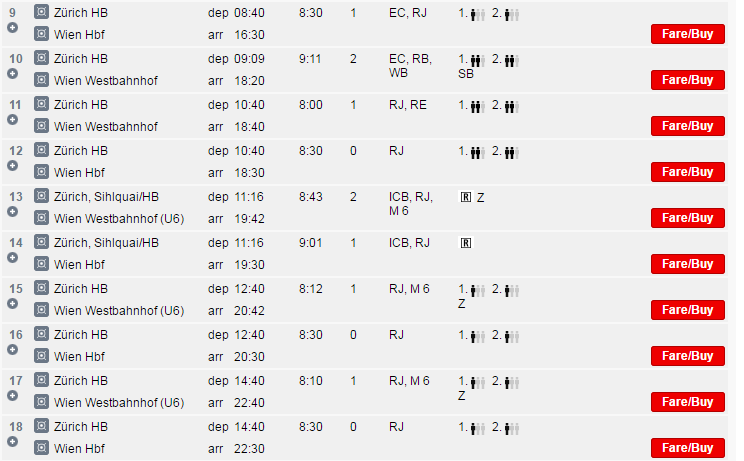 Ниже приведена информация о том, сколько часов вам потребуется, чтобы добраться от Цюриха до Вены, а также приведена примерная стоимость проезда (средняя цена билета) на том или ином виде транспорта.