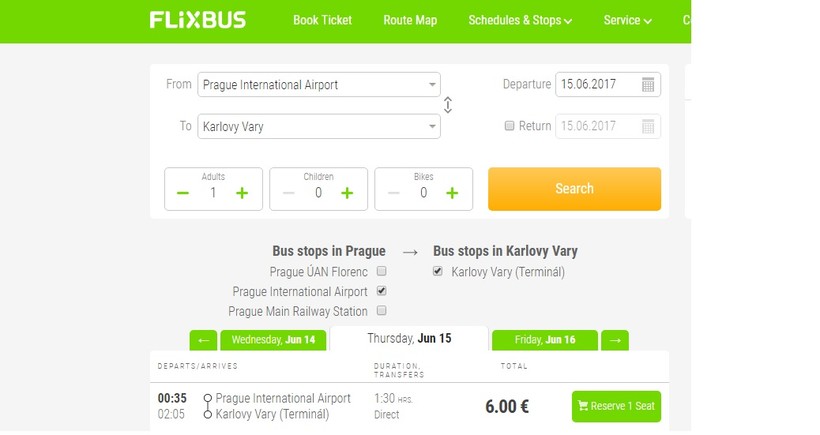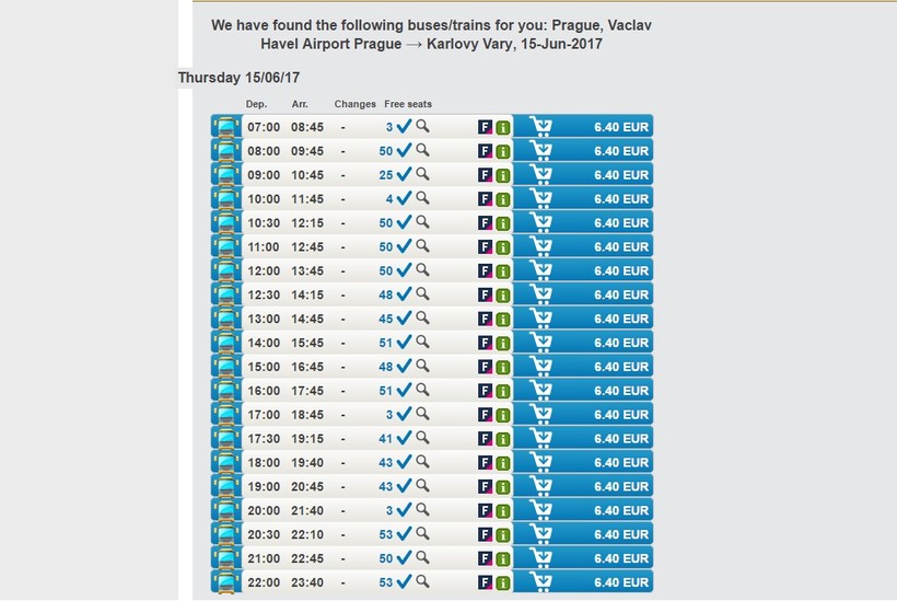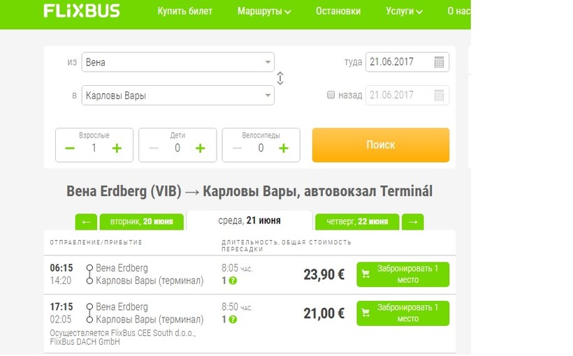 Автобусы Flixbus ездят в Прагу целый день с утра до вечера, а вот в Карловы Вары из Праги лишь дважды: