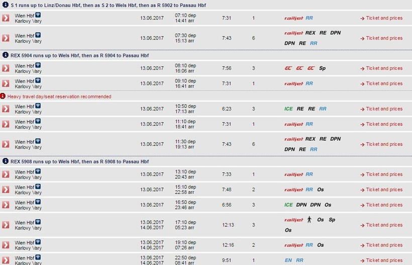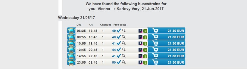Выбирайте варианты проезда с одной пересадкой, по этому маршруту их пять. Поезда отправляются от Wien Hbf и прибывают на станцию Karlovy Vary. Пересадка в Праге занимает 20 минут.
