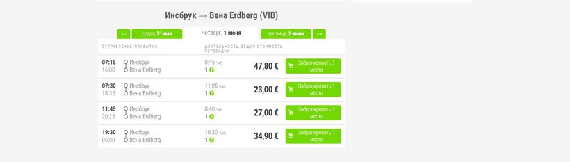Отправляются автобусы от автовокзала в Инсбруке, расположенного по соседству с главной железнодорожной станцией города: Точкой прибытия автобусов в Вене является район железнодорожной станции Erdberg, а конкретнее вот это место: Честно говоря, вариант с автобусом был бы привлекательным если бы не пересадка. Нет, она конечно не доставляет серьезных проблем но это все же не совсем удобно. Да и цена на автобус в данном конкретном случае практически совпадает с ценой билета на поезд (а о нём в следующем разделе).