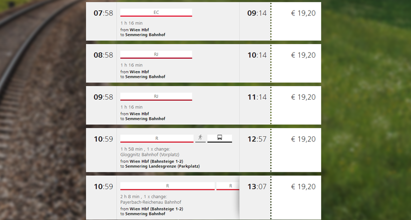 Большинство туристов, и я не исключение, добирается в Земмеринг на общественном транспорте. В частности, с центрального венского железнодорожного вокзала курсируют поезда. Часть рейсов предполагает наличие пересадки, часть рейсов прямые. Дорога займет от одного часа и 15 минут.