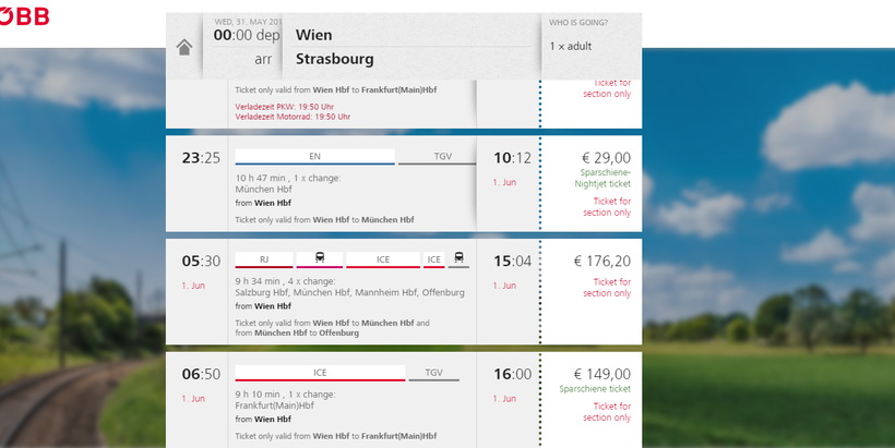 Изучив расписание поездов, я поняла, что в Страсбург из Вены по железной дороге добираться не очень. На сайте австрийских федеральных железных дорог есть график движения поездов, но большинство из них предполагает наличие большого количества пересадок. С одной пересадкой можно добраться, выехав из Вены в 06:50 (прибытие в Страсбург в 16:00), 08:50 (прибытие в 18:47), 23:25 (прибытие в 10:12).