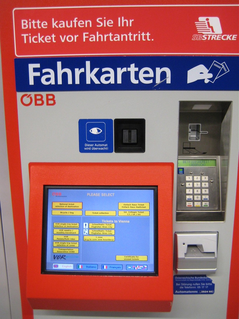На экспресс CAT можно купить на их сайте, а можно в билетном терминале. На пригородный поезд в автомате с отметкой «OBB».
