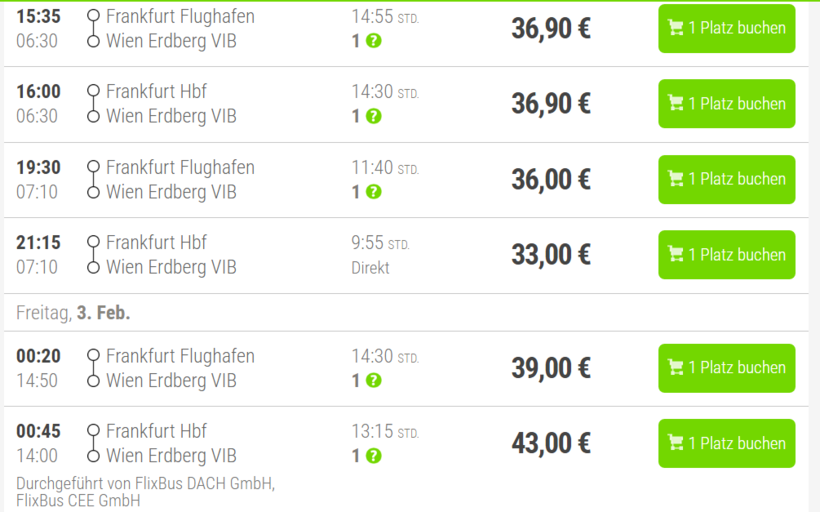 Ниже приведена информация о том, сколько часов вам потребуется, чтобы добраться от Франкфурта-на-Майне до Вены, а также приведена примерная стоимость проезда (средняя цена билета) на том или ином виде транспорта.