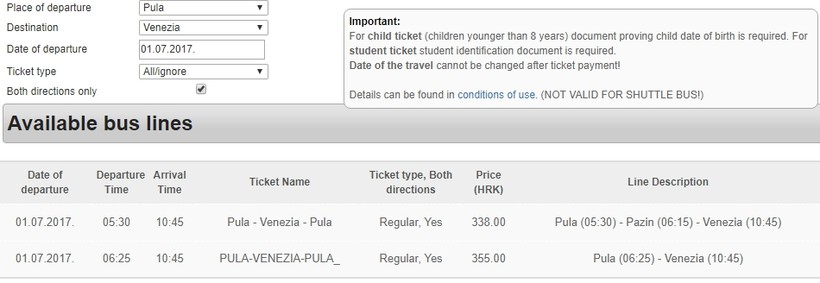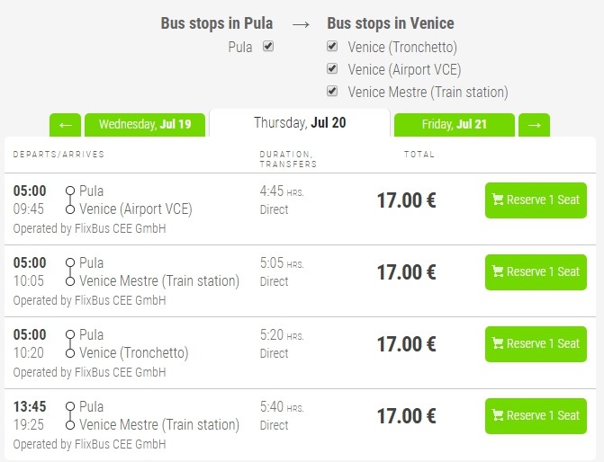 Есть два доступных рейсы — один прямой, а второй автобус является транзитным, что едет из Медулина в нужный итальянский город, а в Пуле делает остановку для посадки пассажиров. Автобусы также комфортные, можно рассчитывать на светлый, чистый салон, мягкие кресла, ТВ и Интернет. В Венеции останавливается в Местре и на автовокзале Tronchetto.