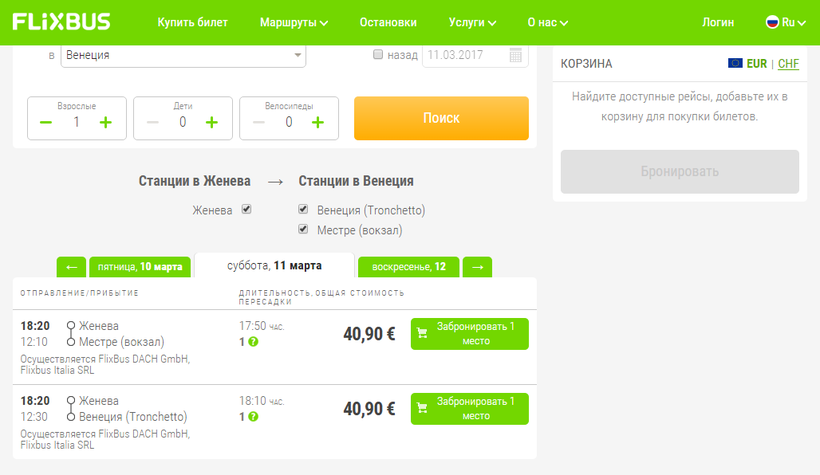 Прямых автобусных маршрутов из Женевы в Венецию я не обнаружил. Можно добраться туда с пересадкой, например автобусом компаний «Flixbus» или «Eurolines», но такое путешествие занимает часов 18-20 и, как ни крути, всё равно стоит дороже авиаперелёта.