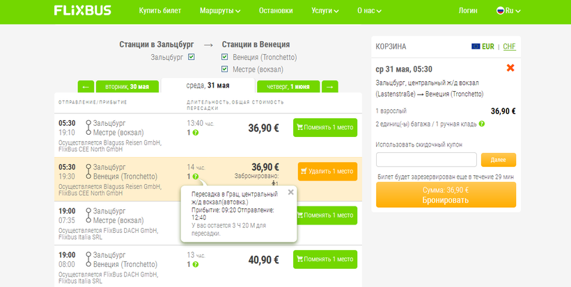 Так как Венеция – ну просто мега-популярный среди туристов город, то я была практически уверена, что добраться сюда из Зальцбурга можно и на автобусе. Я не ошиблась: рейсы между Зальцбургом и Венецией осуществляет транспортная компания FlixBus.