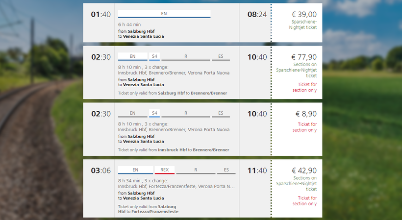 Поезда без пересадок отправляются из Зальцбурга в 01:40, прибывая в Венецию в 08:24. На мой взгляд, это очень удобно, так как у вас в распоряжении будет целый день.