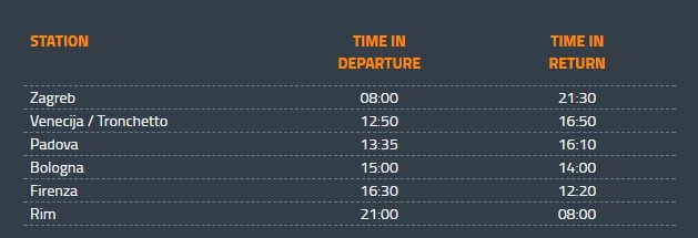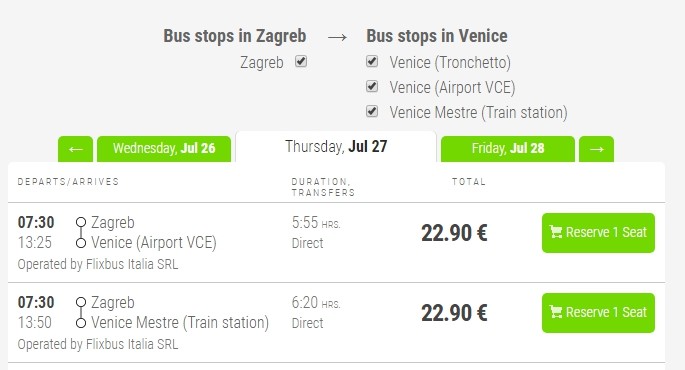 - Vincek. Есть один прямой автобус, который из хорватской столицы идет в Рим, но по пути останавливается в Венеции для высадки пассажиров.