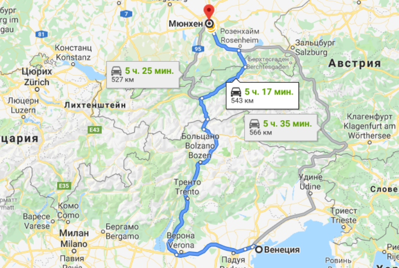 Венецию и Мюнхен разделяют 543 км и территория Австрии. Учитывая то, что все три страны, по территориям которых проходит путь в Мюнхен, являются членами Евросоюза, и границы между ними условные, проехать маршрут за рулем авто можно за 5,5 часов.
