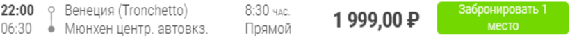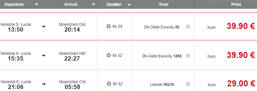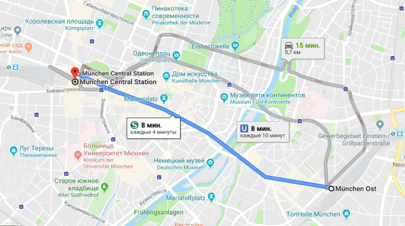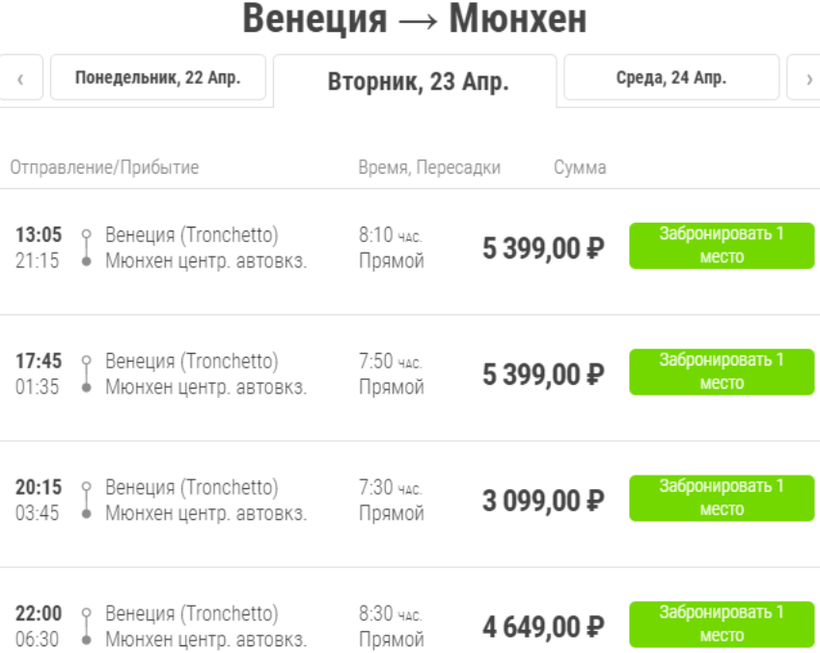 А также обратите внимание, что поезда, отправляющиеся в 13:50 и 21:06, прибывают на ж/д станцию «Мюнхен-Восточный», а поезд, отправляющийся в 15:35, — на центральный ж/д вокзал Мюнхена.