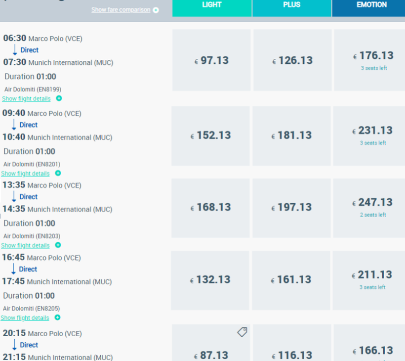 Ежедневно из аэропорта Венеции в Мюнхен за 1 час можно добраться рейсами авиакомпании Air Dolomiti, которые вылетают в 06:30, 09:40, 13:35, 16:45 и 20:15.