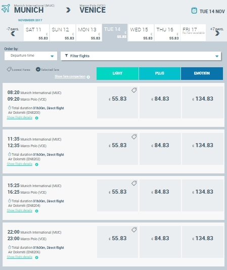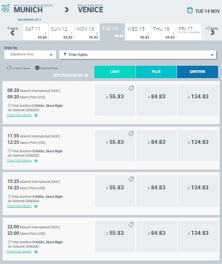 Первым делом решила рассмотреть авиаперелет, прямой, конечно, ведь от Мюнхена до Венеции всего 500 км. Для поиска оптимальных перелетов удобно пользоваться авиапоисковиками в интернете, например, таким. Такие рейсы выполняет компания AirDolomiti, итальянская "дочка" Люфтганзы. Расписание удобное, от четырех до шести рейсов ежедневно, время в полете - один час. Расписание на нужную вам дату можно посмотреть на сайте авиакомпании.