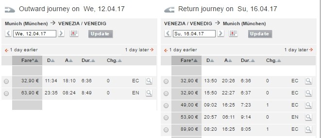 Подумав, что авиаперелет не очень-то и экономичен, к тому же придется ехать в аэропорт, регистрироваться, да и в Венеции добираться от аэропорта, решила рассмотреть железнодорожный вариант. Подробно о железных дорогах Германии вы можете прочитать здесь. Обычный поиск на сайте Deutche Bahn выдавал большое количество пересадочных рейсов, причем цены на них нужно было уточнять на сайтах австрийских и итальянских дорог. Да и пересадки с багажом не вдохновляли. Выбрала вкладку на сайте "Saver fare finder" и получила двойной эффект: отсортировала немецкие рейсы и получила самые низкие цены. Из Мюнхена в Венецию отправлялось два прямых рейса скоростных поездов. Дневной рейс 6 ч.40 мин, ночной - 8 ч.50 мин. в пути.