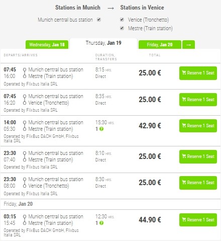Можно добраться из Мюнхена до Венеции на автобусе. Это - самый экономичный вариант, но провести восемь с лишним часов в автобусе под силу не всем. Мне кажется, что такие поездки больше подходят для молодежи. Автобусы компании Flixbus делают ежедневно один дневной и один ночной прямой рейс. Кроме того, есть 2 рейса с пересадкой в Вероне, но пересадка длительная, да и стоимость такой поездки выше, чем прямого рейса.