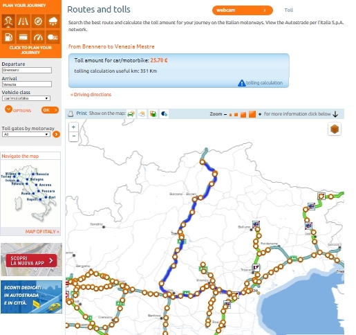 Стоимость проезда легкового автомобиля по платным дорогам Италии по нашему маршруту составит 25,7 евро. Рассчитать ее можно на сайте, задав пункт отправления и пункт назначения.