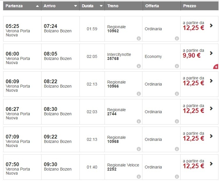 Наиболее простой способ добраться из Вероны в Альпы – это приобрести билет на поезд. Между Вероной и Больцано курсирует масса поездов разного уровня комфорта. Традиционно наиболее бюджетным является пригородная электричка (в Италии она называется Regionale), хотя иногда бывает, что поездка на более комфортном Intercitynotte получается даже дешевле.