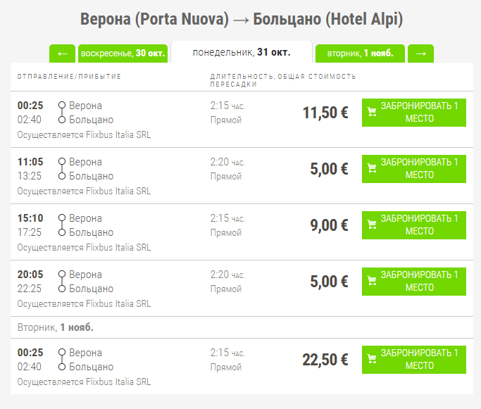 Автобусы FlixBus выезжают с площади, где находится центральный железнодорожный вокзал города Porta Nuova, в 00.25, 11.05, 15.10, 22.05. В пути нужно будет провести около 2,5 часов. Автобусы прибывают в Больцано на остановку возле Hotel Alpi. Это центр города, и отсюда вы сможете без труда добраться в любую его часть.