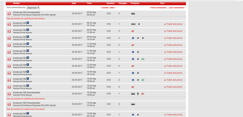 Каждый день из Инсбрука отправляется 7 прямых поездов в Верону, есть еще варианты с пересадкой и они тоже довольно удобные. Первый прямой рейс в 9:24, последний - в 0:30. Время в пути - 3,5 часа, дополнительная пересадка увеличит время поездки на 30-60 минут.