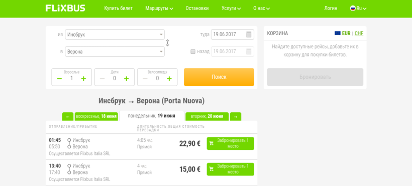 Помимо поездов, в Верону ездят еще и автобусы, отправляются только 2 раза в день, но зато билеты стоят дешевле, чем на поезд. Автобусами Flixbus мне уже приходилось пользоваться, я осталась довольна: большой автобус, чистый салон, интернет, туалет и билеты можно купить дома, сидя на диване.