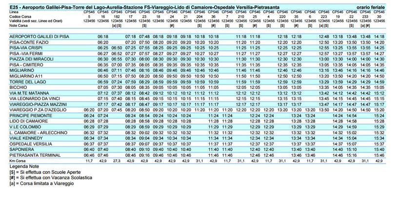 От себя же добавлю, что наиболее удобно садиться либо в аэропорту (адрес Piazzale D'ascanio, 1, 56121 Pisa PI), потому что это стартовая точка для автобуса. Также можно садиться на Via Crispi 93/95. Остальные остановки указаны в расписании, которое можно посмотреть на сайте компании. Нужный рейс имеет номер Е25.