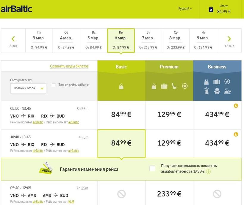 Прямых рейсов до Будапешта, к сожалению, нет. Но зато есть множество вариантов добраться туда с одной пересадкой. Если выбирать по соотношению время в пути/цена билета, наиболее оптимальные предложения я нашла у авиакомпании Air Baltic. Расписание каждый день разное, также оно меняется в зависимости от месяца, сезона и т. д. Но каждый день есть возможность долететь до Будапешта за 4-6 часов, включая пересадку в Риге или Амстердаме. Начало пути – в аэропорту Вильнюса, а доберетесь вы в итоге до аэропорта Будапешта имени Ференца Листа.
