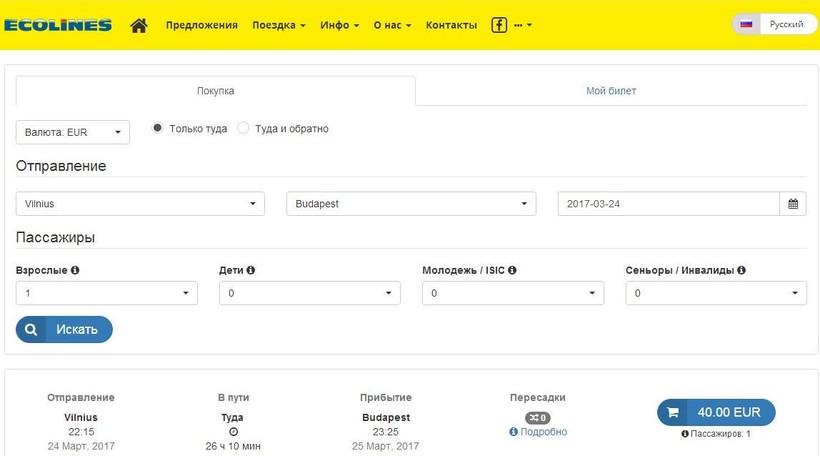 У Ecolines на сайте есть возможность купить билеты, не выходя из дома. А можно приобрести их в точках продаж компании или у водителя. Последний способ не советую, так как он есть не на всех рейсах, не стоит проверять это на себе. Да и места могут быть уже раскуплены, раз отправления всего дважды в месяц.