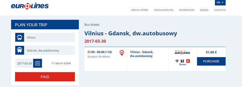 Регулярные прямые рейсы из Вильнюса в Гданьск осуществляет компания Eurolines. Правда доступен только один автобус, который отправляется в 21.00 с центральной автостанции Вильнюса. Вот на карте отметка, где точно она находится.